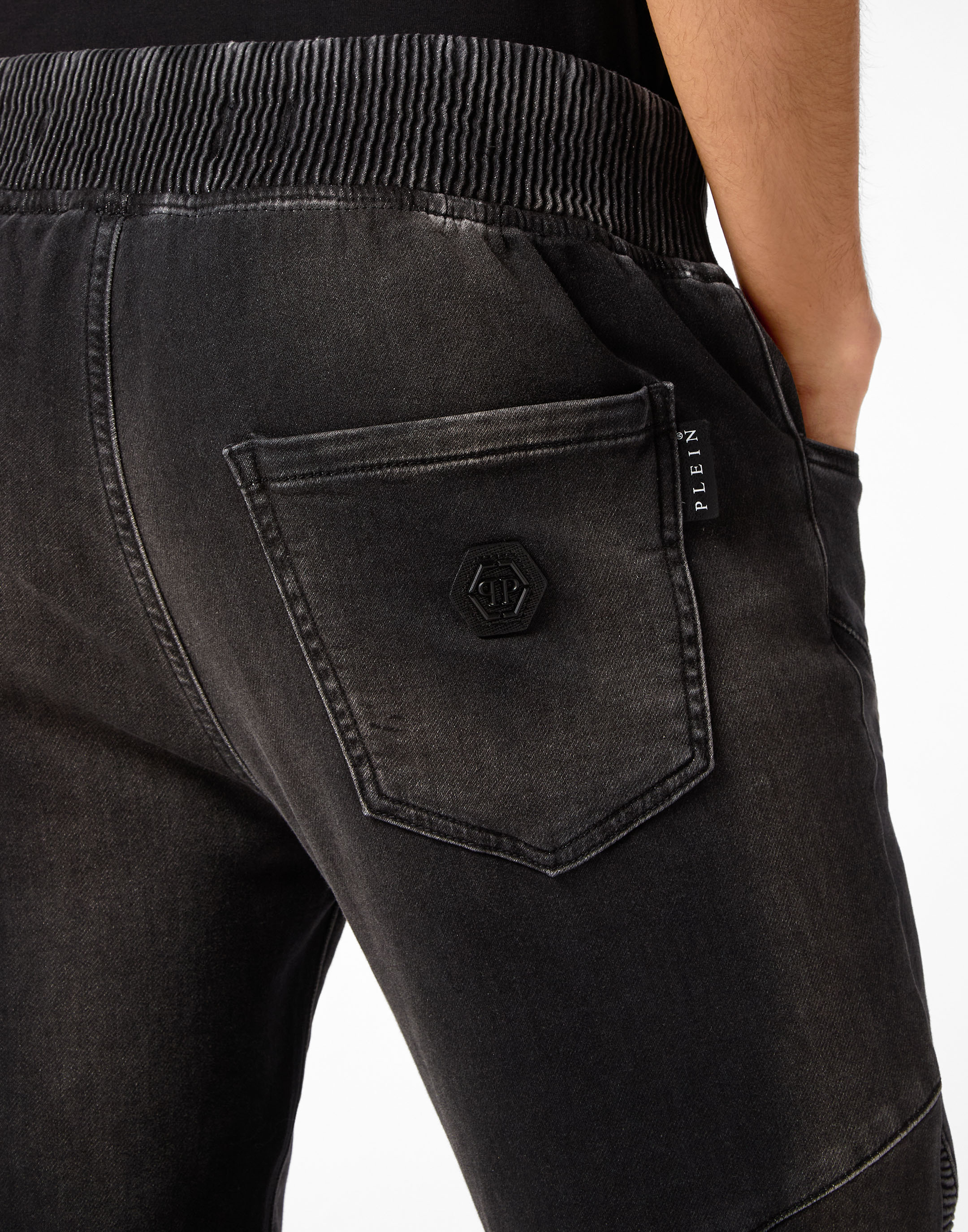 ● Stone washed denim with placed wear-and-tear
