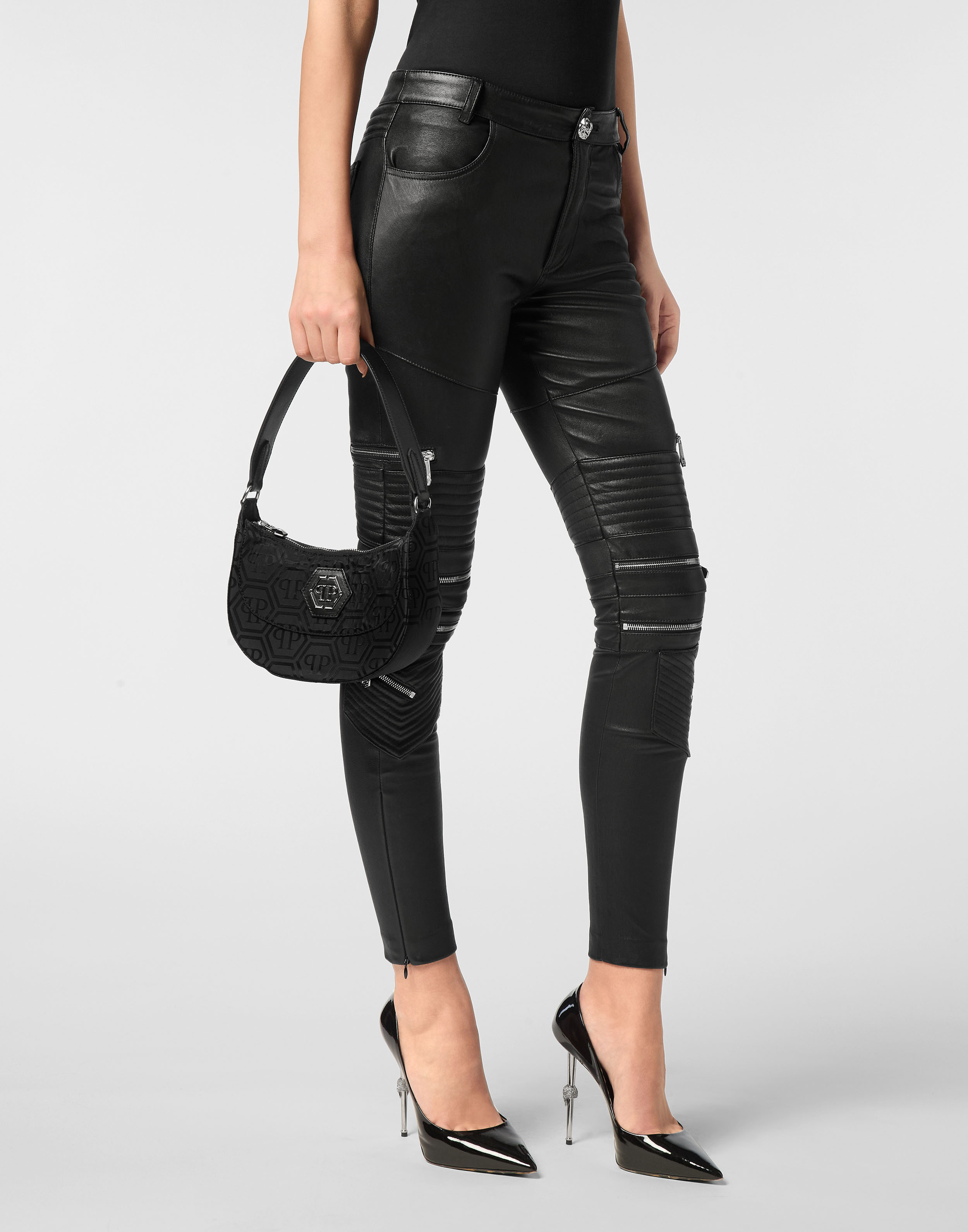 The style of Plein is perfectly embodied by this shoulder bag. Check out the details.